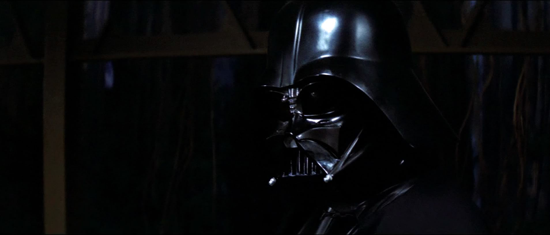 The scene starts with a pan down from the Death Star looming in the sky over Endor to Darth Vader entering. The shot of the Death Star is a stark reminder that the Empire is assembling its deadliest force here, but also a reminder that the Emperor is above this scene.