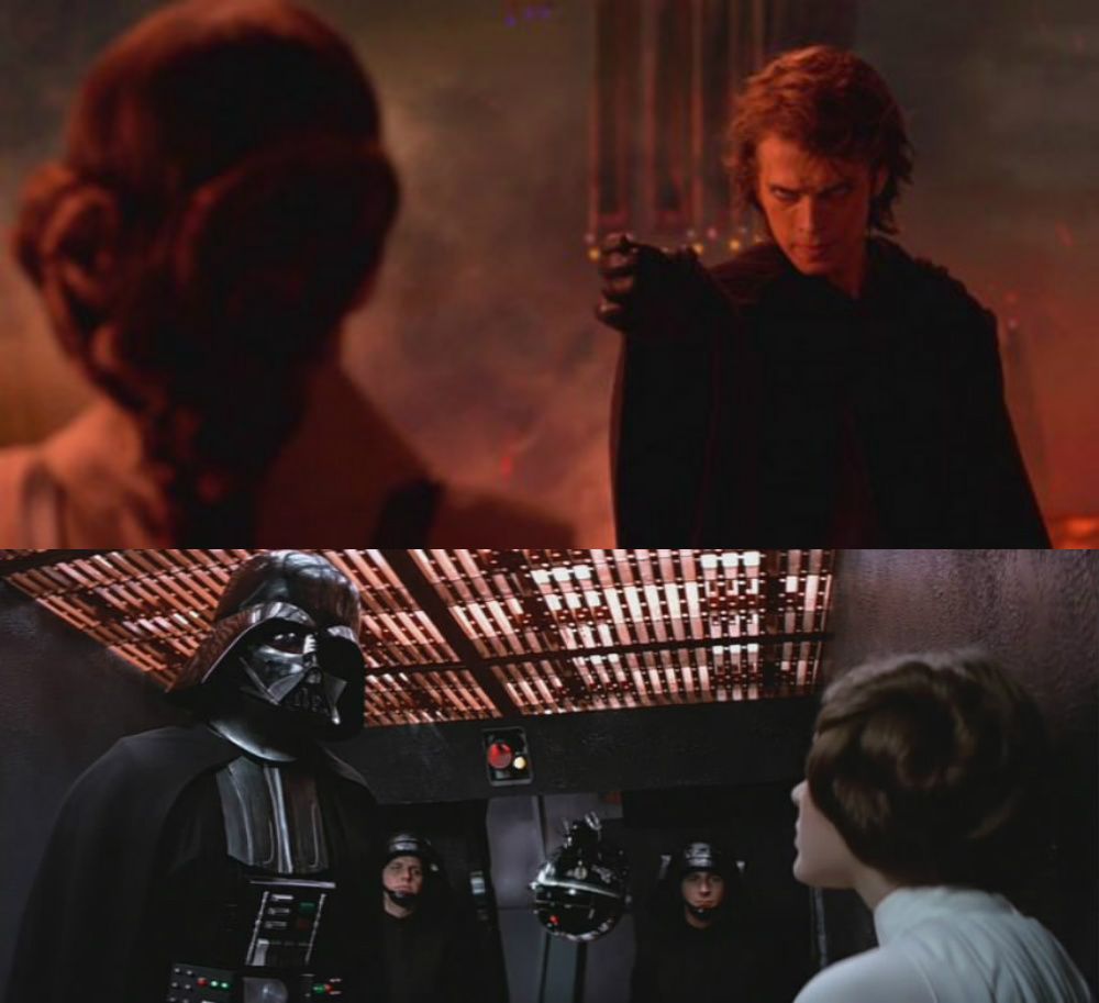 And this is where the interesting inversion happens for both. In a ring structure, there needs to be some form of reversal in which the stories diverge and move in different directions. While Leia moves from impending doom to being rescued by the teamwork of the other two main characters in the trilogy’s trio (Luke and Han), Padme goes from being seemingly safe in Coruscant, thanks to Obi-Wan and Anakin’s rescue of Palpatine to being indirectly pushed to death by both Anakin and Obi-Wan. These events are significant for the Rebellion and Republic. Han and Luke’s rescue is a huge boost for the Rebellion in both the short and long term while Palpatine’s rescue by Anakin and Obi-Wan hints at safety but ultimately proves to be the Republic’s demise.