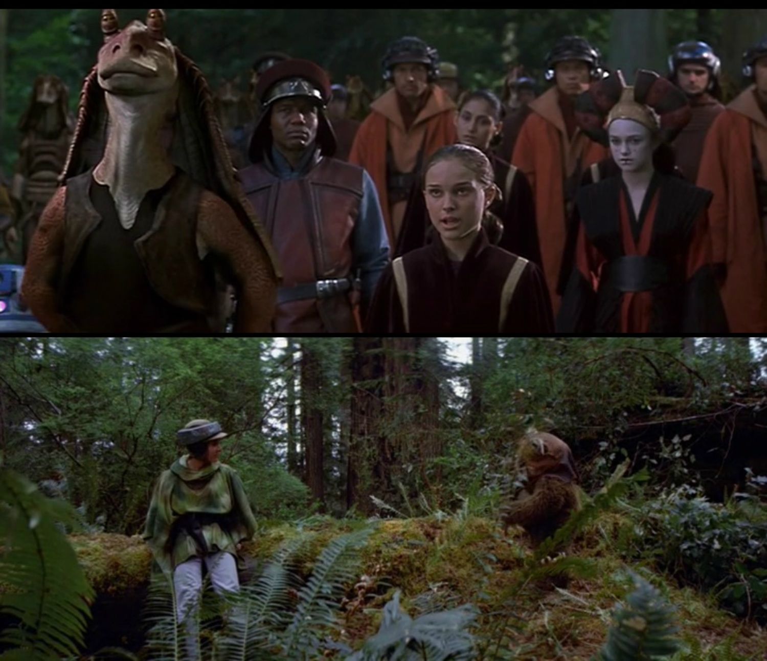 Both women also undergo identity revelations in each corresponding film that alter their rank or station. Padme, reveals herself to be the rightful Queen of Naboo and not just some handmaiden while Leia learns that she is the daughter of Darth Vader and sister of Luke Skywalker and thus a potential Jedi as well. Leia’s empowerment by the end of “Jedi” correlates with the Rebel Alliance’s victory over the Empire.