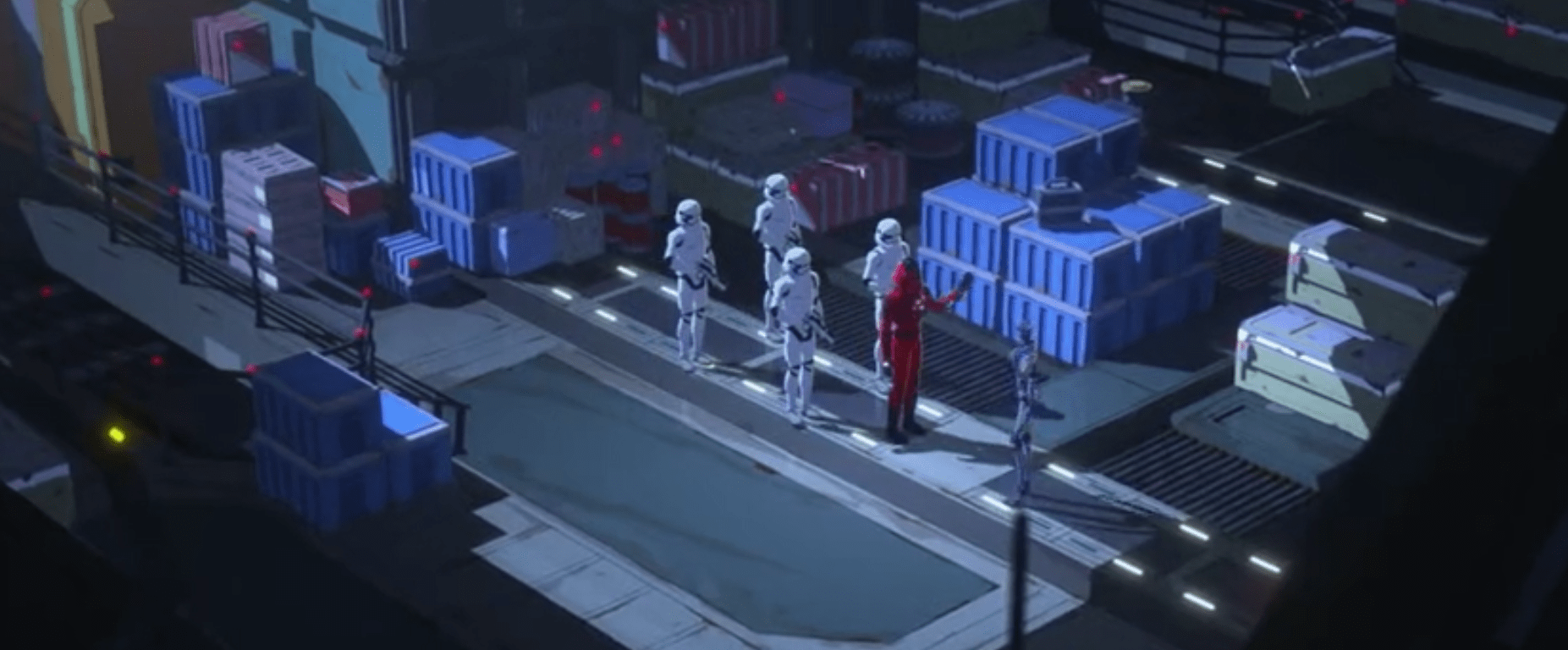 That storyline continues here and Kazuda and his friends witness the arrival of red Tie Pilot Von Reg on the station for some shady deal-making with the commander of the station.
